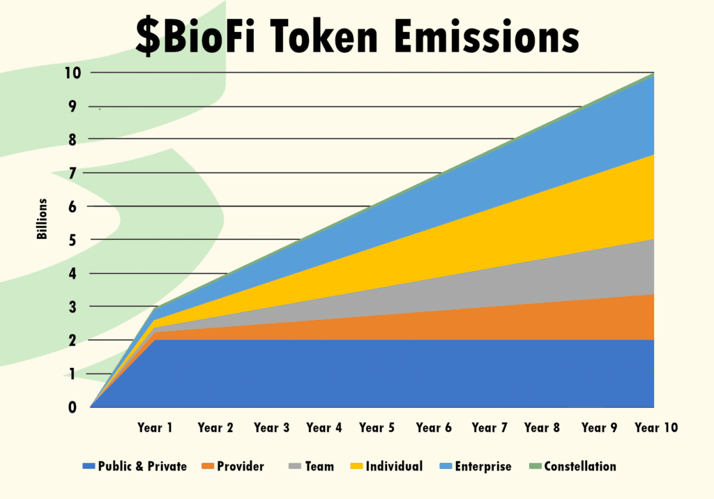 The table below illustrates the high-level description of the $BioFi utility token launch. Minting completed in Q1 2022 and the Launch was implemented on April 20th, 2022. The graphs below indicate the use and emissions of the tokens over a 10-year period.